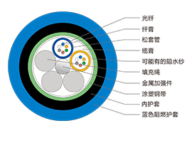 1、中心束管式:由內(nèi)到外依次為光纖,光纖膏,松套管,細(xì)鋼絲(多跟圍繞成一圈),鋼帶,PE內(nèi)護(hù)層,阻燃護(hù)套(藍(lán)色)