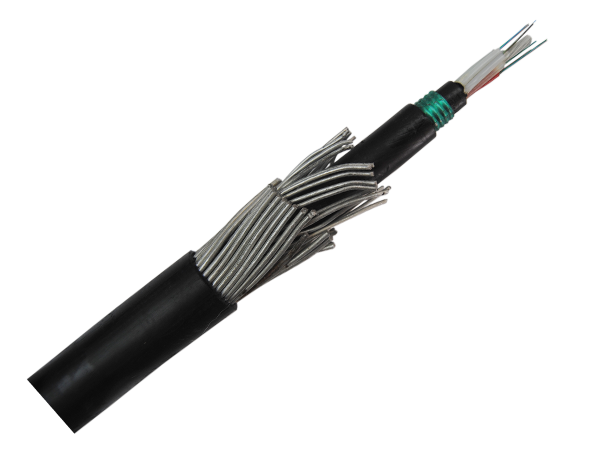 GYTA53+33光纜的結(jié)構(gòu)是將單?;蚨嗄9饫w套入由高模量的聚酯材料做成的松套管中,套管內(nèi)填充防水化合物,纜芯的中心是一根金屬加強(qiáng)芯,對于某些芯數(shù)的光纜來說,金屬加強(qiáng)芯外還需擠上一層聚乙烯 (PE),松套管 (和填充繩) 圍繞中心加強(qiáng)芯絞合成緊湊的圓形纜芯,纜芯內(nèi)的縫隙充以阻水填充物,涂塑鋁帶 (APL) 縱包后擠一層聚乙烯內(nèi)護(hù)套,雙面鍍鉻涂塑鋼帶(PSP)縱包后擠制聚乙烯中護(hù)套,再經(jīng)單層細(xì)圓鋼絲鎧裝后,最終擠制聚乙烯外護(hù)層成纜。
