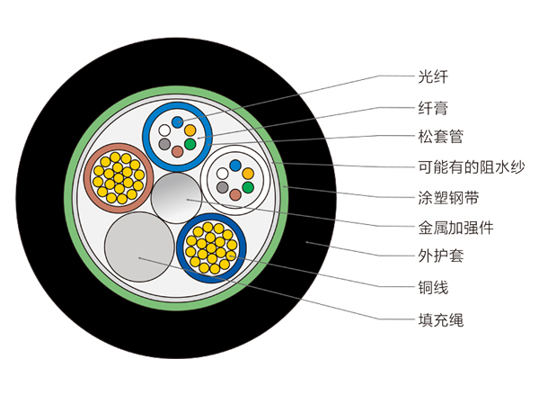 4、軟銅線,可在較長范圍內(nèi)提供電力能源,光纖保障高帶寬信號傳輸,是解決遠距離無人值守機房、小區(qū)機房、移動基站、用戶接入等應用的理想綜合解決方案