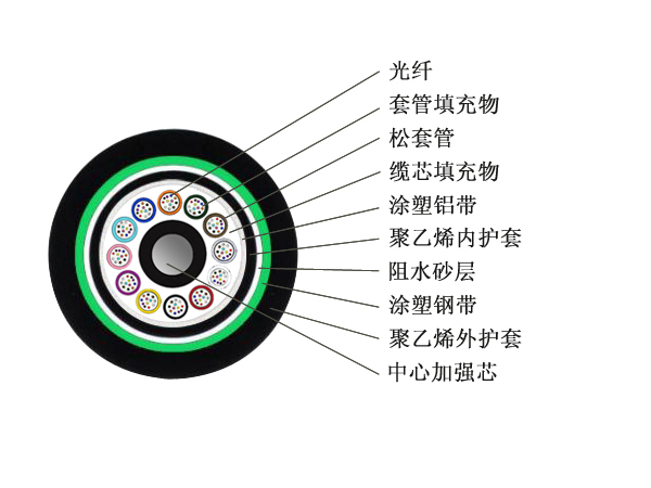 GYTA53光纜的結構是將單?;蚨嗄9饫w套入由高模量的聚酯材料做成的松套管 中,套管內填充防水化合物。纜芯的中心是一根金屬加強芯,對于某些芯數(shù)的光纜來說,金屬加強芯外還需擠上一層聚乙烯 (PE)。松套管 (和填充繩) 圍繞中心加強芯絞合成緊湊的圓形纜芯,纜芯內的縫隙充以阻水填充物。涂塑鋁帶 (APL) 縱包后擠一層聚乙烯內護套,雙面鍍鉻涂塑鋼帶 (PSP) 縱包后擠制聚乙烯外套成纜。